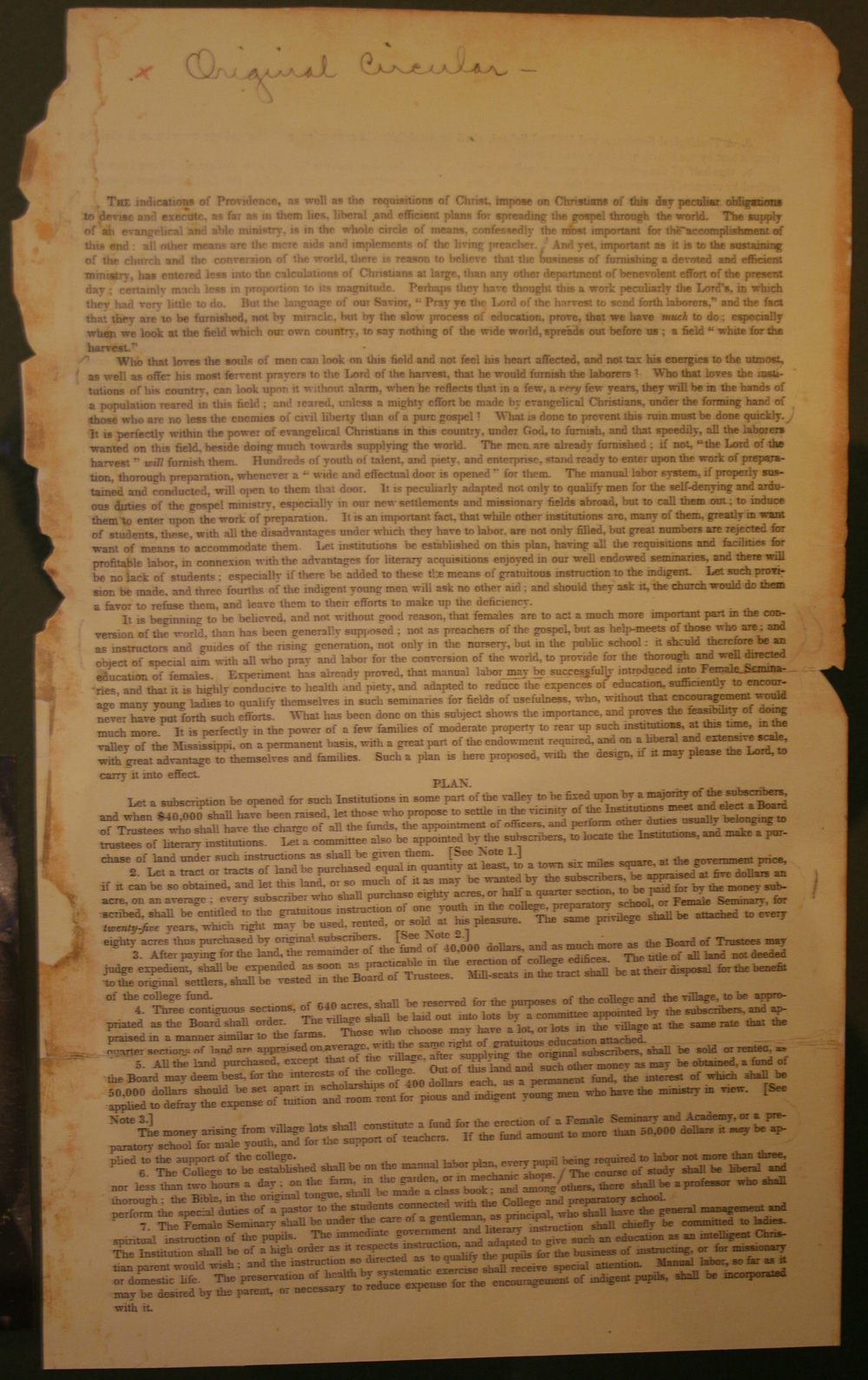5. All land purchased, except that of the village, after supplying the original subscribers, shall be sold or rented, as the Board may deem best, for the interests of the college. Out of this land and such other money as may be obtained, a fund of 50,000 dollars should be set apart in scholarships of 400 dollars each, as a permanent fund, the interest of which shall be applied to defray the expense of tuition and room rent for pious and indigent young men who have the ministry in view. [See Note 3.]