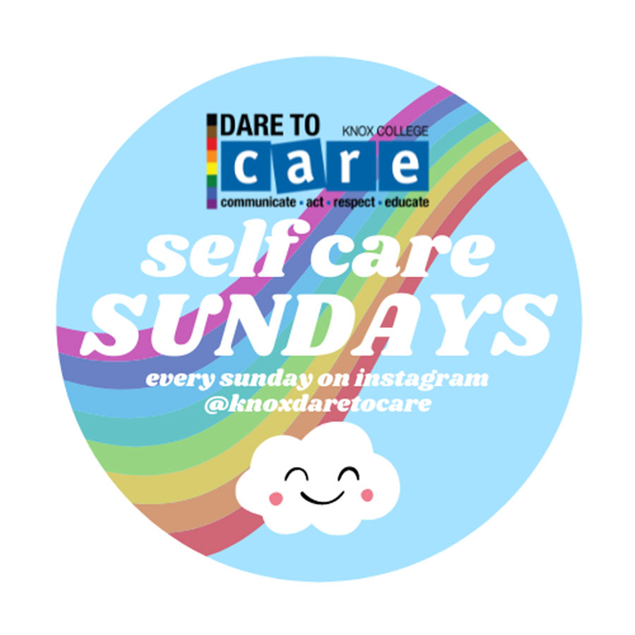 The Knox College campus recognizes the crucial need of intentional and restorative self-care, especially during stressful times like college. However, it is often difficult to know exactly what is meant by ‘self-care’, and it can be confusing to figure out what self-care looks like for you and your life. Therefore, the Dare to Care Peer Educators have begun Self-Care Sundays, a social media programming initiative intended to give students ideas or inspiration for how to make some time for themselves, as well as share the self-care utilized by the Peer Educators themselves and other fun faces around campus. Each Sunday during the academic year, we will share a weekly post on our Instagram, @knoxdaretocare, detailing a new practice of self-care that we encourage you all to give a try!