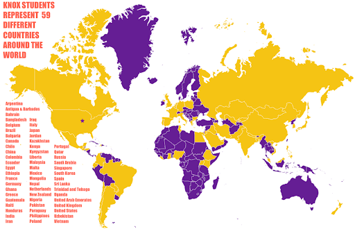 Please see the map of countries represented on Knox’s campus below!