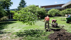do not fill the gaps," observed the Knox Alumnus in 1964, after 78 elms came down due to Dutch Elm Disease. Large trees are also expensive, prompting the College to ask for donations to recover from what a trustee described as the "tree disaster" of the '60s. Today, an informal policy is to plant two trees for every one that's removed, and trees are an integral part, not an afterthought, in the campus landscape planning now underway.