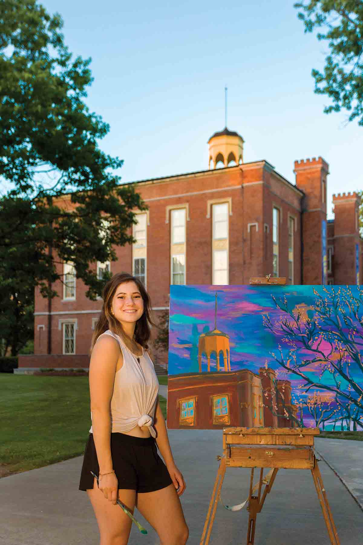 Elise Goitia ’18 places her easel near the spot where she made this painting of Old Main and its iconic bell tower.