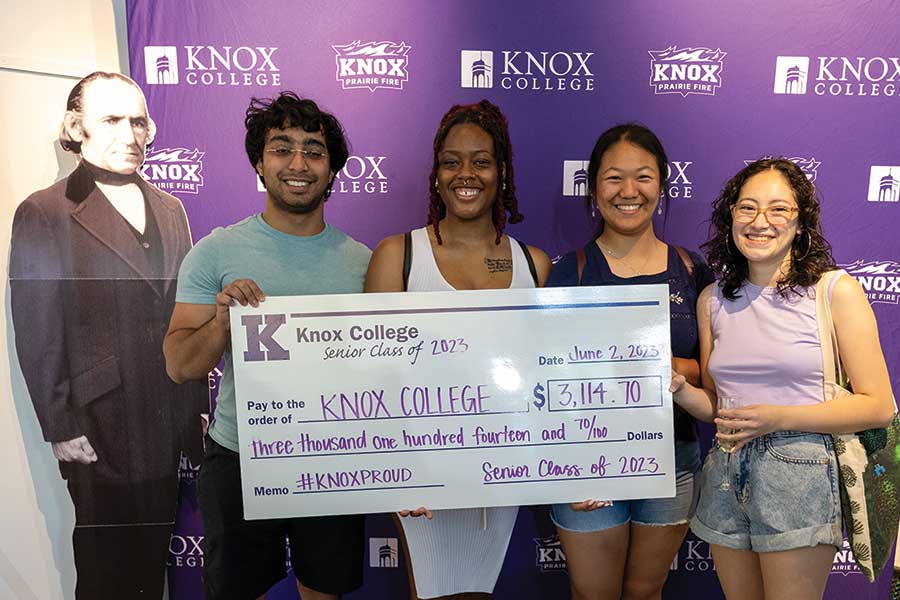 The Class of 2023 Senior Challenge Committee challenged their peers to make a gift to honor their transition from students to alumni. More than 50% of the graduating class took part. Pictured are members of the committee presenting a check at the Senior Toast during Commencement. Members of the Senior Challenge Committee shown are Omar Qureshi; Katherine Zhang, class president; Vanessa Jackson, vice president; and Josie Lopez, secretary/treasurer. Not pictured are committee members Kamille Sloane, Juan Ramirez, Mike Martinez, and Sarah Hoffmann-Weitsman.