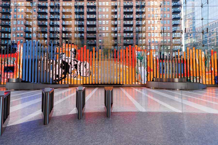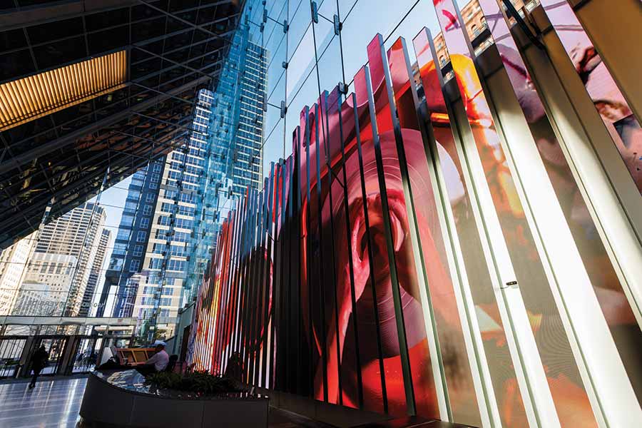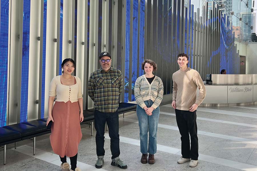 In May, Knox College graduate Ingrid Wasmer ’21 and current student James Adamson ’24 debuted their art installation, “Full-quieting,” at 150 N. Riverside Plaza in Chicago. The winning entry in the 2022 150 Media Stream contest featured a video showing the artists working on various physical art pieces, highlighting motion and process of painting, ceramic work, and digital animations. The video appeared on a uniquely designed digital display made up of 89 LED blade panels.