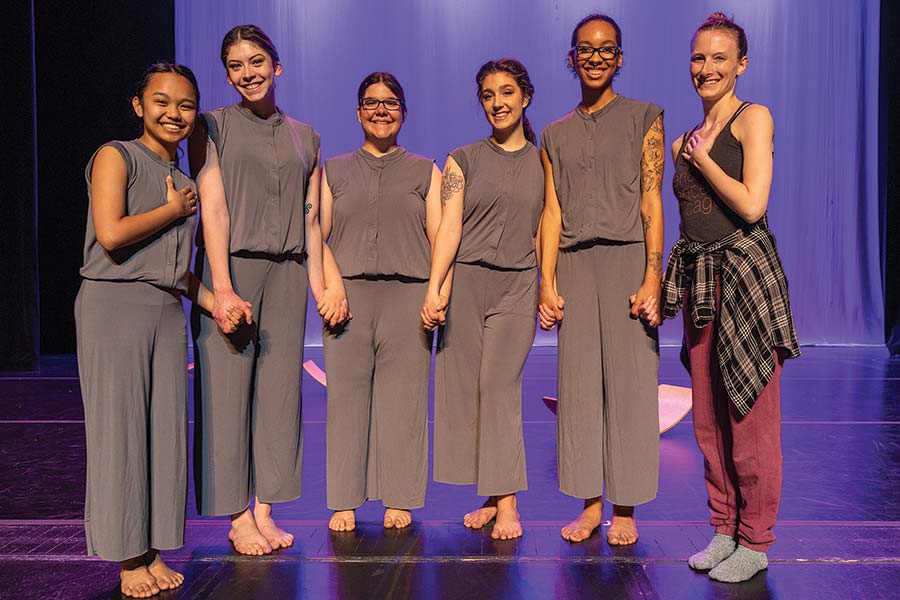 All Knox students were invited to learn the basics of aerial dance during workshops held on campus. Six students auditioned and were chosen for the public performance at The Orpheum Theatre. Shown below, from left: dancers MJ Opulencia ’25, Gwen Merrick ’24, Madelyn Pellegrino ’26, Marina Hope ’24, Aicha Chemani ’24, and Lauren Reed, Aerial Dance Chicago choreographer. Not Pictured: Knox student Tristan Blus ’23 who light-designed part of the performance.