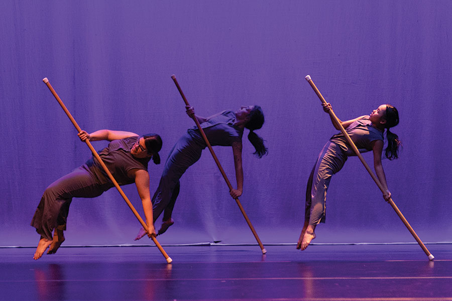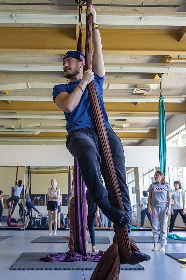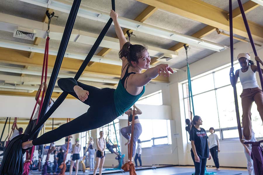 Earlier this year, Knox College students had the opportunity to study and work alongside professional dancers from the Aerial Dance Chicago team. The group was trained on special techniques used by the professional dance company, including free barres (large poles), hanging silks, and swinging apparatuses. The weeklong dance residency culminated in a sold-out performance at the Orpheum Theatre in Galesburg featuring Knox students alongside the professional dance troupe.