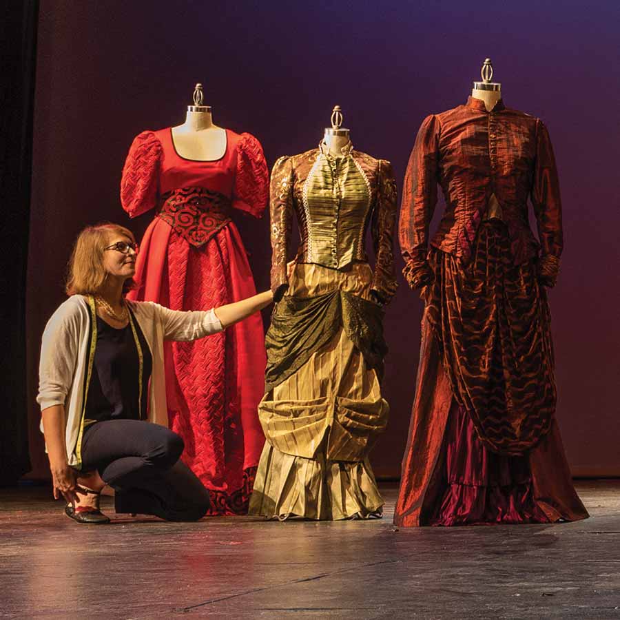 Her work with costume designer Allison Smith Hahn ’10 and theatrical designer Craig Choma ’93 represents the intersection of her academic theatre and professional theatre lives, as both artists have designed for her professional company in Chicago, Vitalist Theatre. What Liz does professionally informs what she does academically, and the inverse is true. Several of the costumes and the set models in this photo are from Vitalist productions.