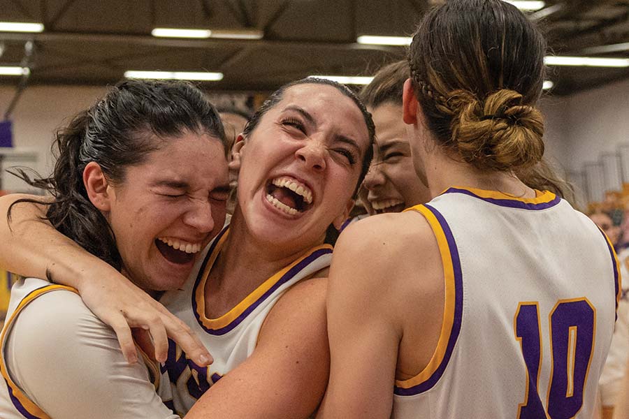 The Prairie Fire women’s basketball team celebrates after defeating Illinois College 63-62 on February 14, 2023. The women clinched a share of the Midwest Conference (MWC) title and moved on to win their first MWC tournament in a game against Ripon, 64-61, on February 25. Catessa Duran ’23 (left) was named to the first MWC team. Sophie Elstone ’24 (center) contributed 10 points in the championship game.