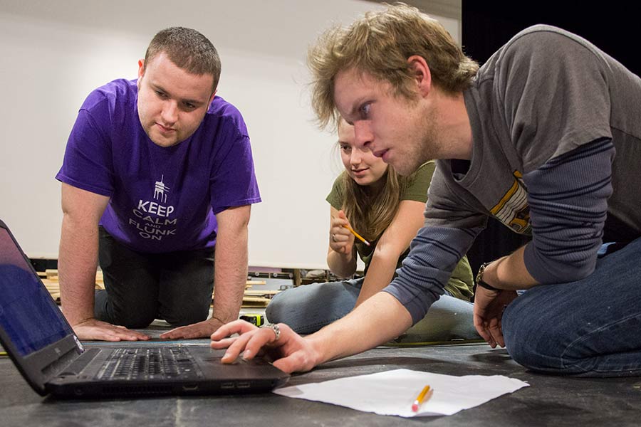 Pictured above, Nashra Mahmood '17 at the Galesburg Farmer's Market. Pictured below, Ian Tully '17 checks set dimension for Richard III and Jeremy Schmidt '17 sets up biometric attachments to monitor physiological responses with the assistance of Carly Miller '17.
