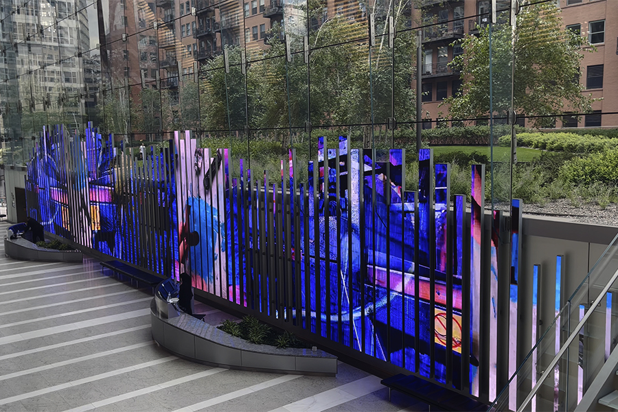 Wasmer and Adamson traveled alongside Stedman to Chicago in August to showcase a one-minute sample of their work from over the summer. The installation is a uniquely designed digital display, utilizing 89 separated LED blade panels.