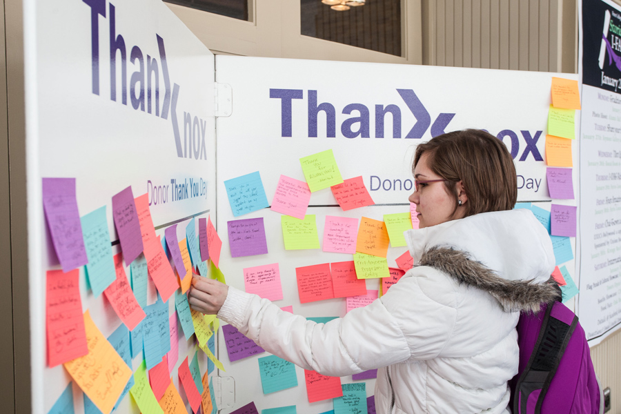 "The goal of Donor Thank You Days is to help current students, as well as the entire campus community, better understand the impact that gifts from alumni, parents, and friends have on their education and their daily Knox experience," says Julie Layer, director of the Knox Fund, the College's annual giving program.
