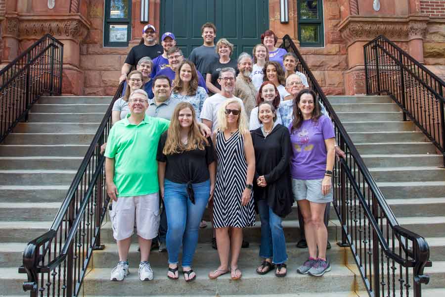Legacy students and their families, from left to right, first row: Ben Shakman '90, Lizzy Shakman '23, Charleen Shakman '91, Maria Elswick, Amy Anderson. Second row: Dan Drozdik, Lindsay Drozdik '23, Liz Drozdik, Barry Elswick, Sophia Elswick '23, Rik Henke. Third row: Ann Deardorff Huneke '67, George Safford '65, William Hope, Marina Hope '23, Tina Hope. Fourth row: Brayden Bathgate '23, Diana Litney Hutzell, Andrea Bradshaw '23. Fifth row: Cory Bonstead '04, Jonathan (J.J.) Silander '23, Annette Zemek '81.