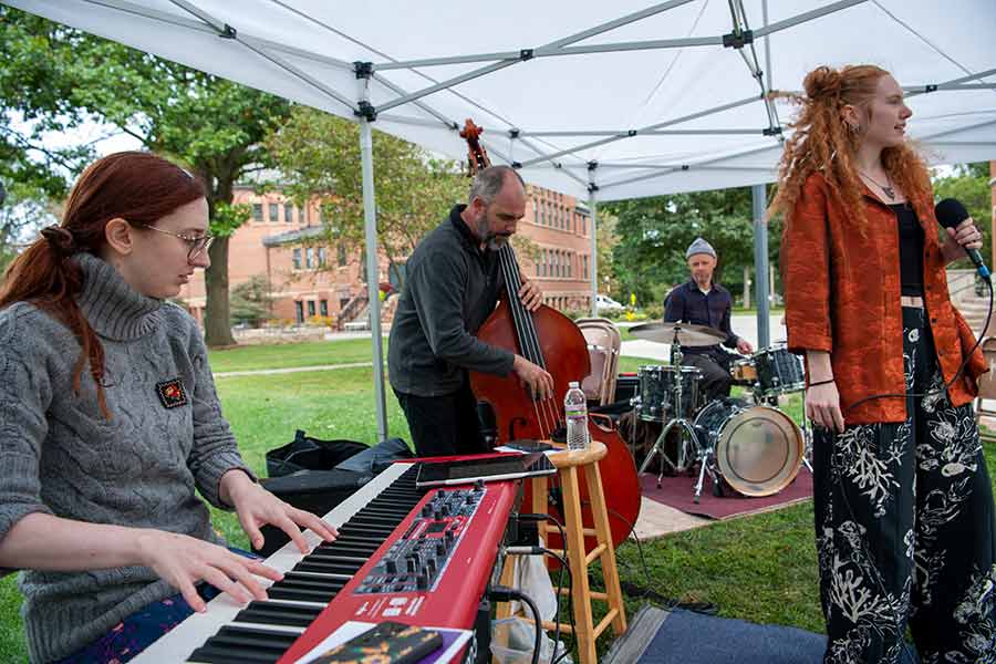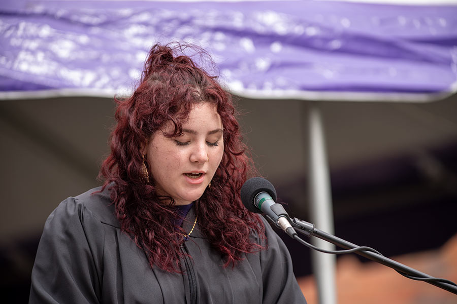 Provost and Dean of the College Michael Schneider welcomed new and newly promoted faculty and awarded the Philip Green Wright/Lombard College prizes to faculty. Deirdre Dougherty, assistant professor of educational studies, received the junior faculty prize, and Sherwood Kiraly, assistant professor of English and theatre and writer-in-residence, and Stuart Allison, Watson Bartlett Professor of Biology and Conservation, and director of the Green Oaks Biological Field Station, were joint recipients of the senior faculty prize. Mary Crawford, associate dean of the college and Philip Sidney Post Professor of Chemistry, welcomed the newest inductees to Phi Beta Kappa: Addison James Anderson ’24,Kaitlyn McKenzie Cashdollar ’24, Kayla Marina Hope ’24, Minh Thy Nguyen Le ’24, and Jia Yi Self ’24.