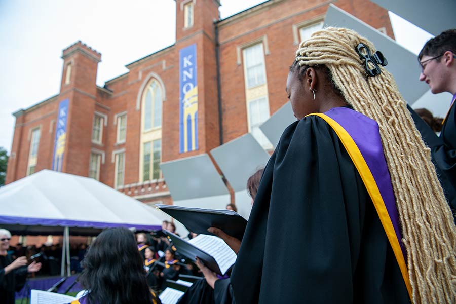 The Cherry Street Combo, led by Andy Crawford ’00, performed during the processional and recessional, and the Knox College Choir, under the direction of Laura Lane, professor of music, opened the ceremony with a haunting Finnish song, “Kaivo.” The choir led the audience in “The Knox Hymn” at the conclusion of the program.