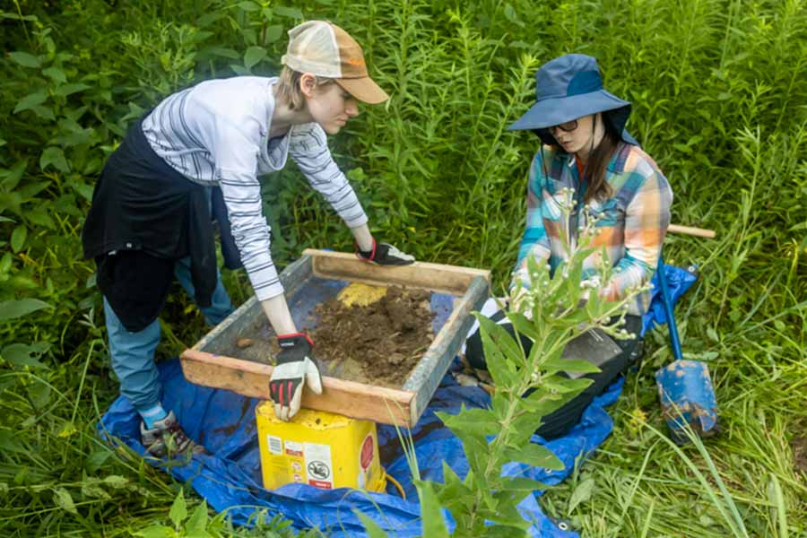 Katie Adelsberger, professor of environmental studies, and Danielle Fatkin, associate professor of history, often spend their summers in the scorching heat of Egypt and Jordan on archaeology projects, but this summer they traded sun and sand for sun and soil much closer to home, at the Green Oaks Field Station, located 20 miles from Galesburg.