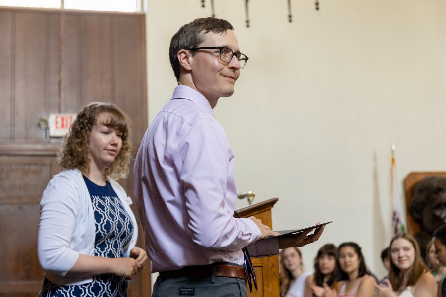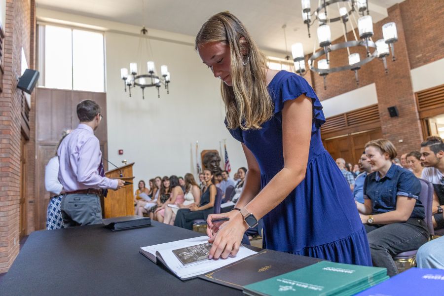 This year’s event, held on June 3, 2023, marked the 106th annual initiation ceremony, led by Chair and Associate Professor of Classics Mitchell Parks and Assistant Professor of Political Science Katie Stewart. The ceremony also welcomed Provost and Dean of the College Michael Schneider, who spoke on the history of the society and its long-standing traditions.
