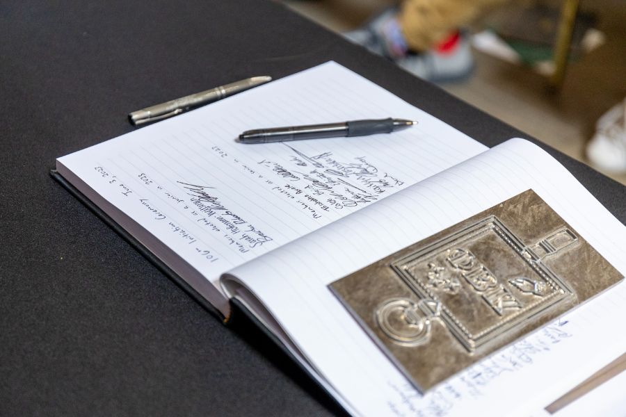 Initiates were called one by one to accept their certificates. They were also taught the secret handshake of the society, which they practiced with Parks and Stewart before signing the chapter’s membership journal.