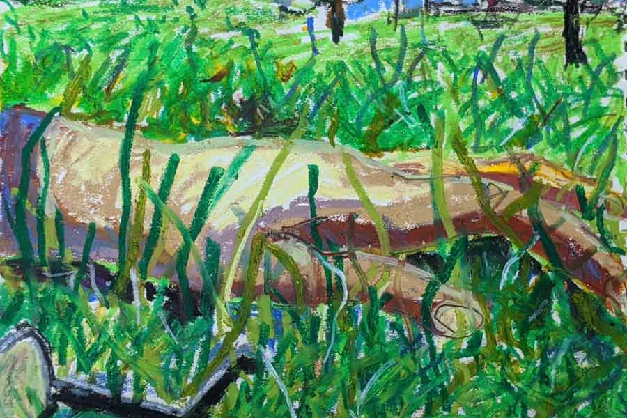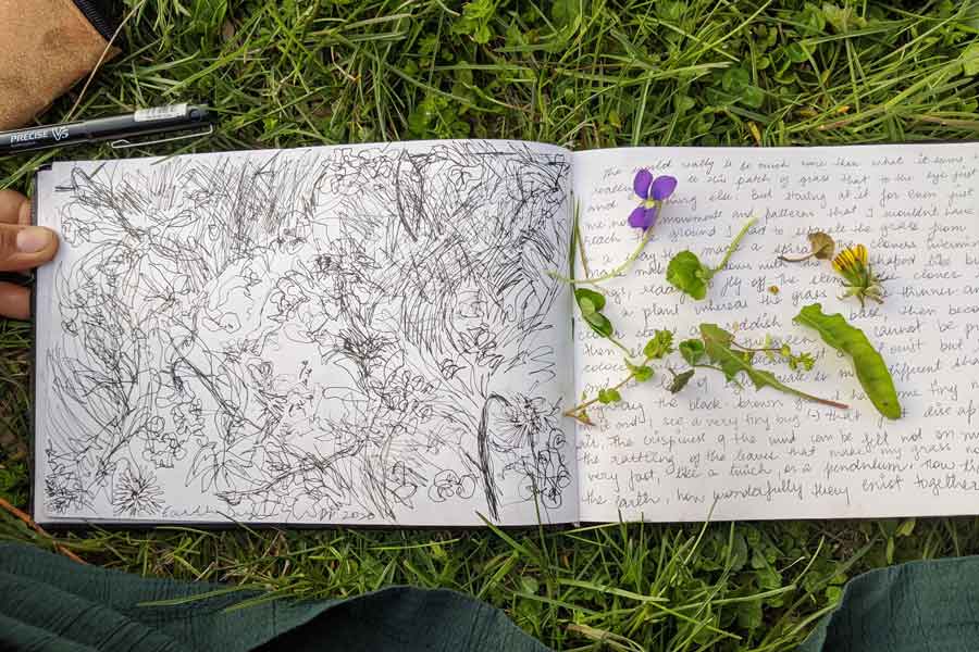 Ben Farrer, assistant professor of environmental studies, sang two songs—one from the musical Cats and an original composition—and Knox students Isaac Hughes '21, Lily Lauver '21, Fiona Munro '20, and Soleil Smith '20 each read their own writing or read from a favorite environmental text. Sachika Goel '20 took everybody outside for some live sketching (as pictured in the gallery below).