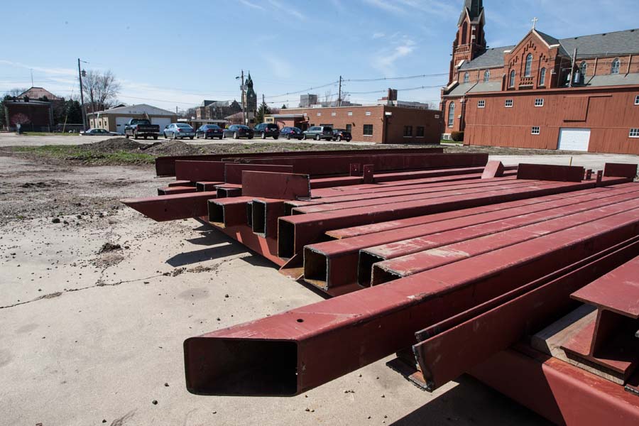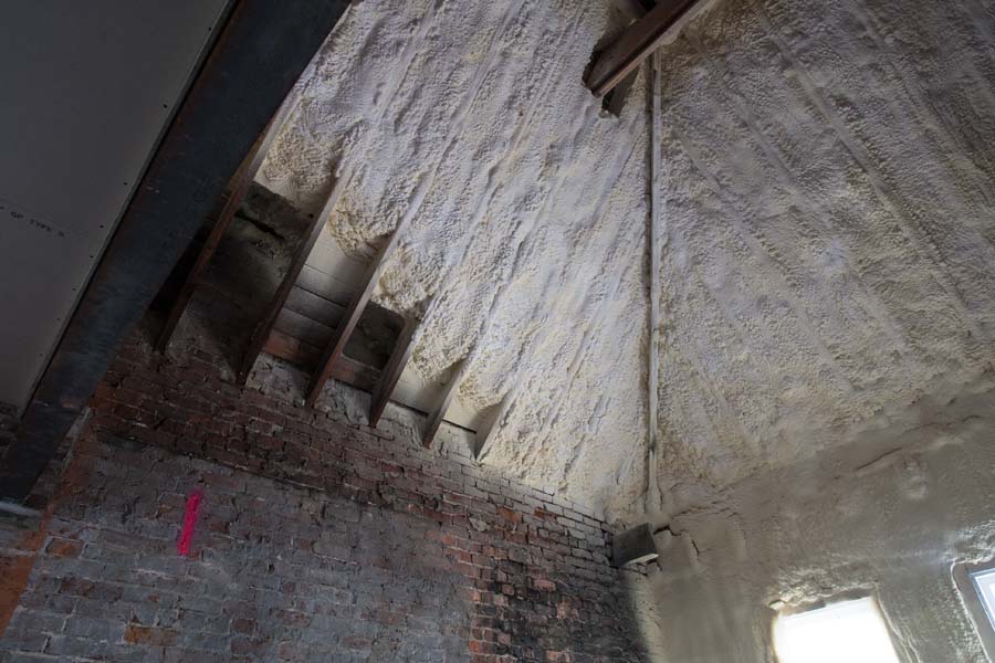 Below, foam insulation boosted the energy efficiency of the 127-year-old roof; temporary steel beams supported the original exterior walls during renovation; after removal, the steel beams were stockpiled for reuse