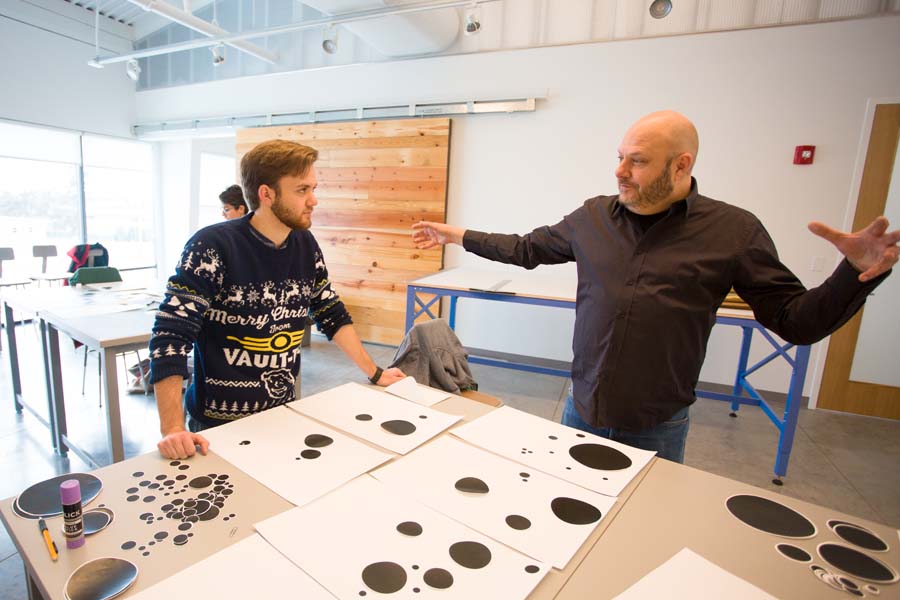 Professor Mark Holmes with students in sculpture studio