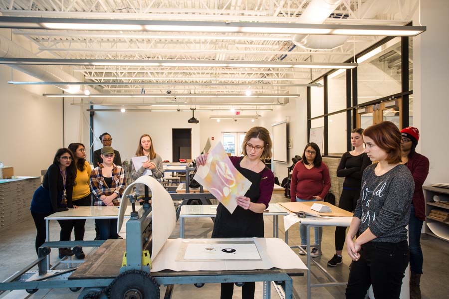 The 30,000-square-foot building houses teaching and studio space for art and art history, including painting, drawing, printmaking, sculpture, ceramics, photography, metal and wood working.