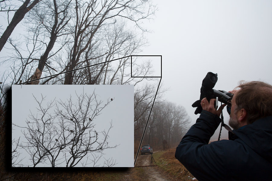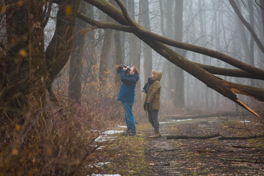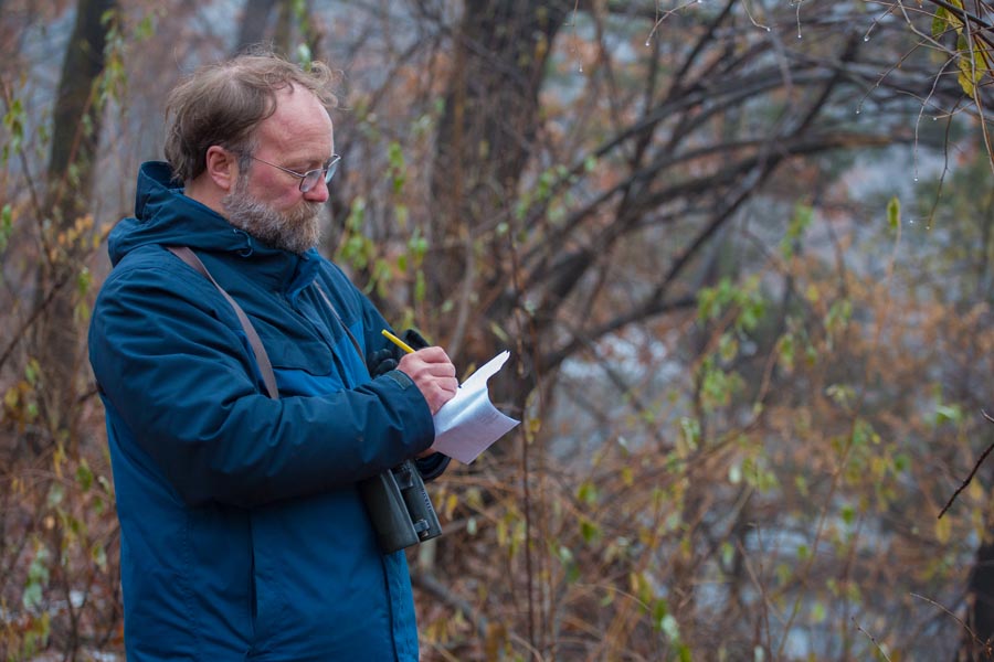 Dense pre-dawn fog in December was not as much of a hindrance as one might expect. "It was quite calm, no wind to speak of, which makes it easier to hear birds," Mountjoy says. "Even during daylight hours, a lot is based on sounds. At this time of year, the leaves are off the trees, but the vocalizations are often how I first detect them, and often the identification is based on the vocalizations."