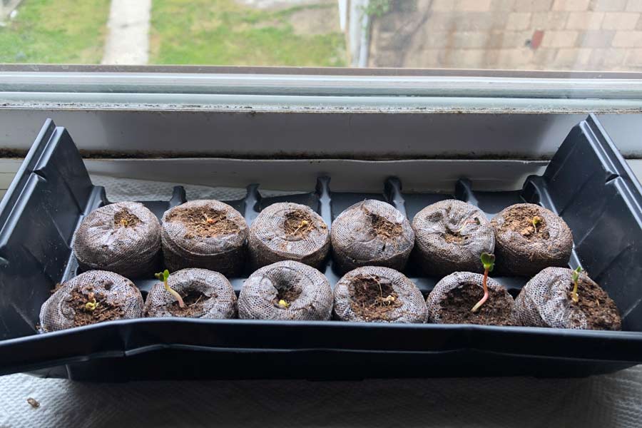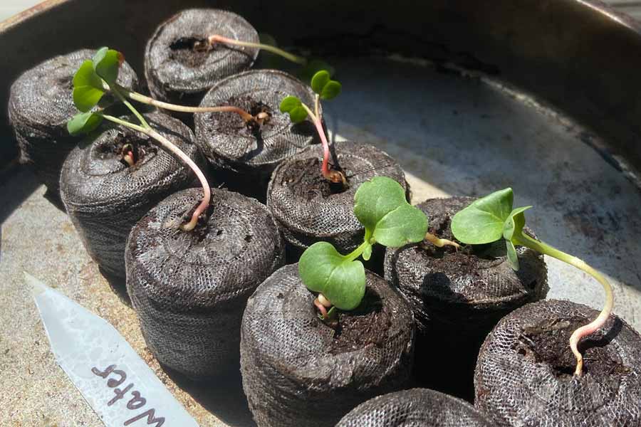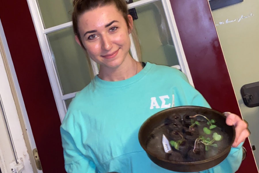 Gallery photos: Seedlings grown by Kiki Kelley '22 (photo provided by Stuart Allison), seedlings photographed by Eli Scriver '22, Kaylyn Spencer '22 with her plants