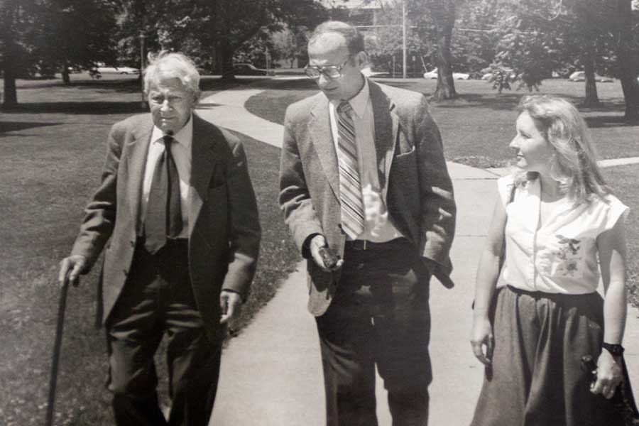 Below, Linda Dybas in lab with Knox student; teaching College for Kids; walking on the Knox campus with famed geneticist Sewall Wright and Knox biology professor Bill Geer in 1985...