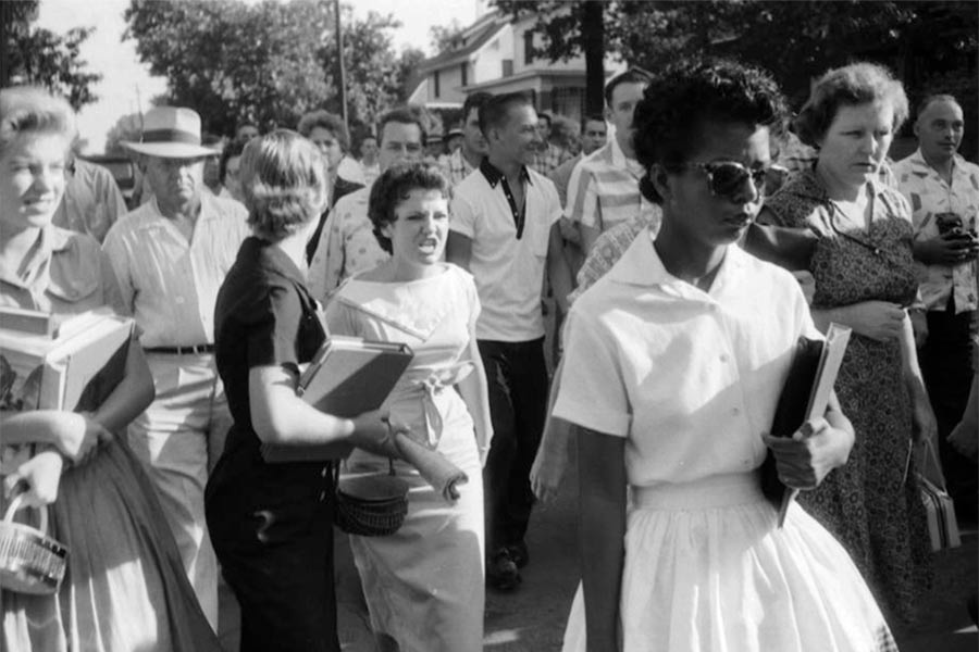 Photo above: Elizabeth Eckford in front of Little Rock Central High School in Little Rock, Arkansas. Photo below: Elizabeth Eckford walking to Little Rock Central High School in 1957 (Will Counts Collection: Indiana University Archives).
