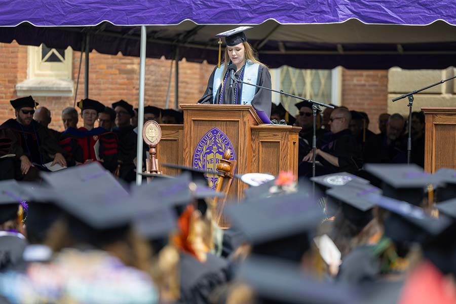 Senior Class Speaker Alexandra Marcoullier '23 opened her speech by thanking her mom and friends who helped her get to this moment. She urged her fellow classmates not to downsize the achievements they are celebrating, stressing the importance and scope of graduating from college. She remarked how the Knox experience focuses on students engaging in the human-powered experience, but never knowing what that truly meant until her four years were complete. She said that, for her, the human-powered experience was shaped by everyone she met along the way. “For four years, we were a community that powered each other,” she said.