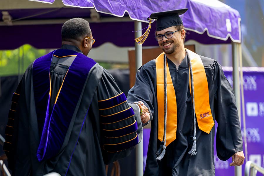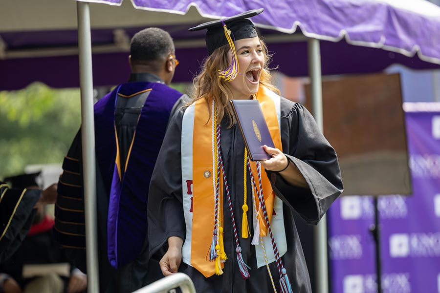 Finally, the graduates approached the stage and Provost and Dean of the College Michael Schneider took to the podium to announce the names of those receiving their degrees. Students formed a line of black gowns and purple and gold cords as they waited for their turn to walk across the sunny stage and complete their Knox journey.