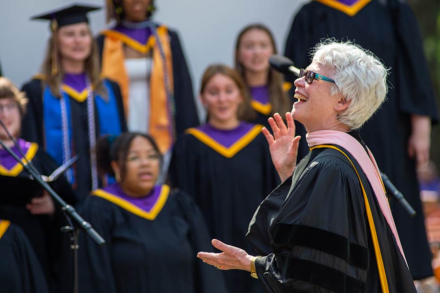 Knox College President C. Andrew McGadney took the stage following a spirited performance of “Unclouded Day” by the Knox College Choir. McGadney opened with a dedication to Professor of Music and Director of Choral Activities Laura Lane, whose 40-year career at the College comes to a close following Commencement.