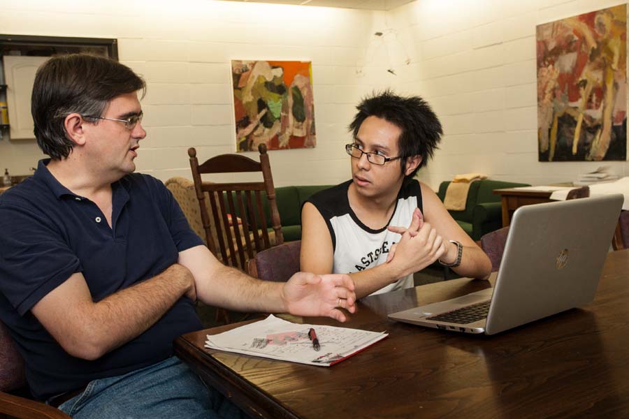 Photo above, two students confer on their project in StartUp Term; below, computer science professor David Bunde works with student Hai-Le Son. More views of Computer Science at Knox on Flickr: In classes and research; in the StartUp Term interdisciplinary immersion program that simulates a high-tech business incubator; in the annual sumo robot wrestling meet.