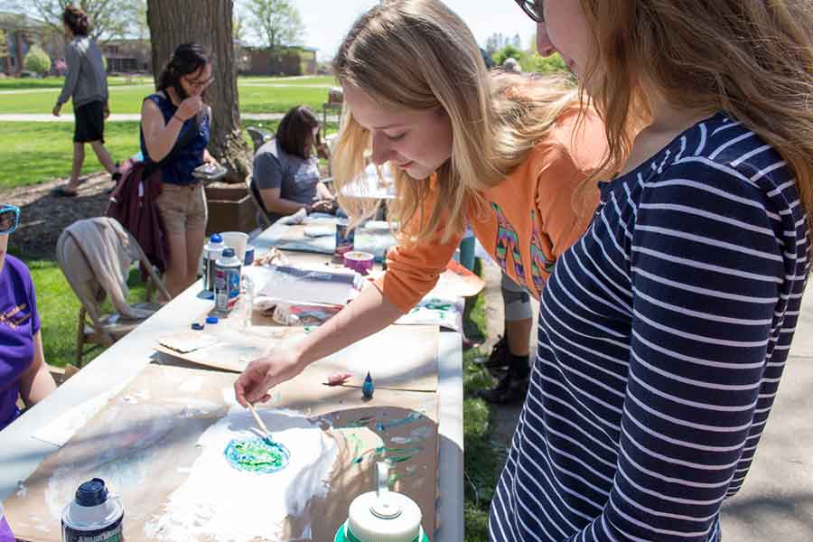 Knox College community members and Galesburg residents gathered recently near the Gizmo patio for the annual Earth Day Festival, presented by Knox Advocates for Recycling and Environmental Support. The club, also known as KARES, was responsible for planning and running the event, which featured booths from campus organizations and local businesses, games, and live music.