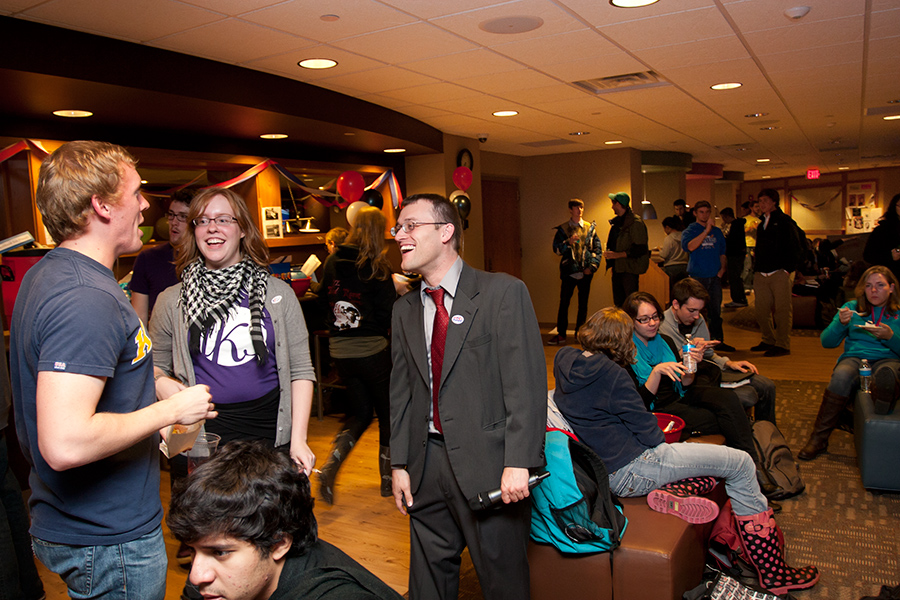 Amid balloons, streamers, and a cake bearing the likenesses of both major presidential candidates, about 200 Knox College students, faculty, and staff gathered Tuesday night to talk politics while monitoring results of the 2012 presidential election.
