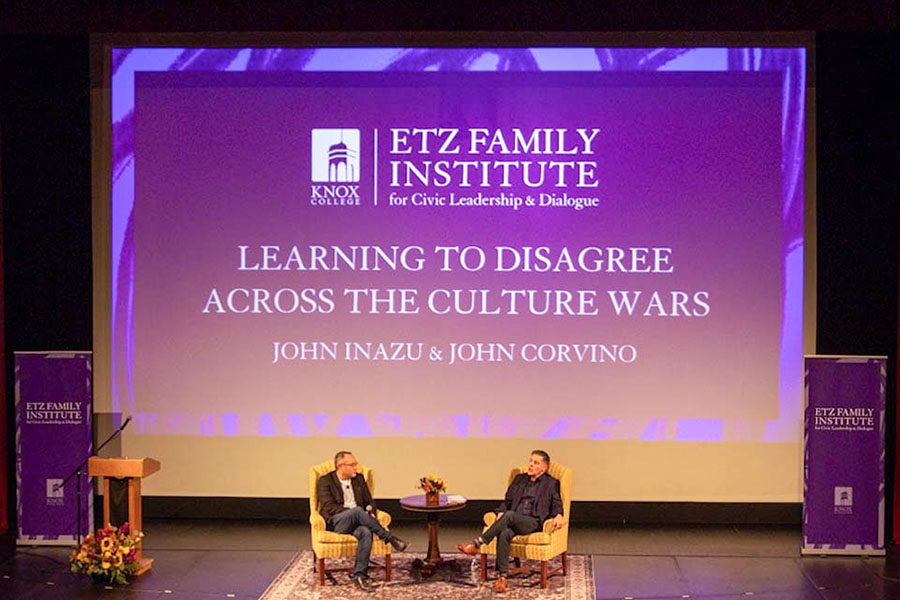 The event welcomed nearly 400 guests from the Knox and Galesburg communities to engage in a dialogue between two renowned experts in civil discourse: John Corvino, Dean of the Irvin D. Reid Honors College and a professor of philosophy at Wayne State University, and John Inazu, the Sally D. Danforth Distinguished Professor of Law and Religion at Washington University in St. Louis.