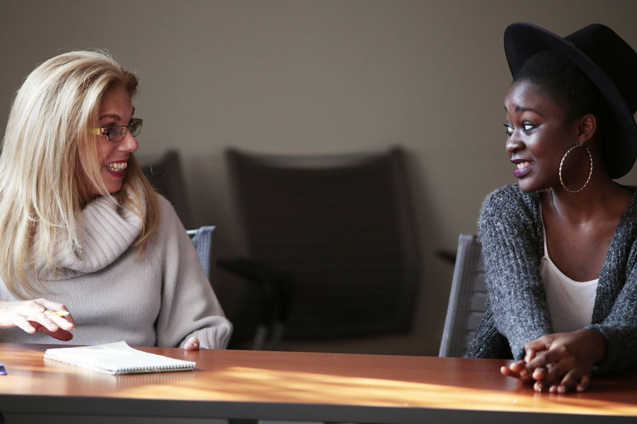 (Photos above and below: Christine Herbes-Sommers, at left, speaks with Knox students at Fall Institute.)