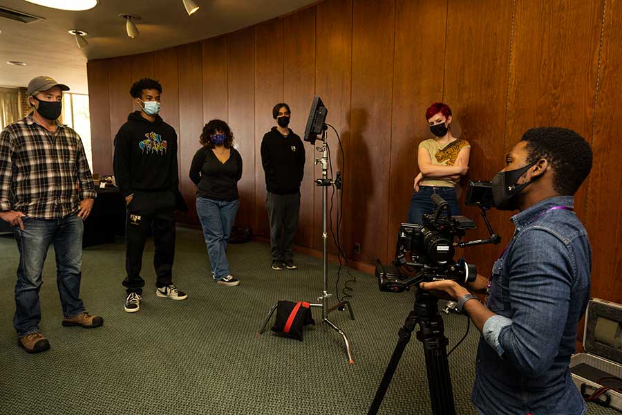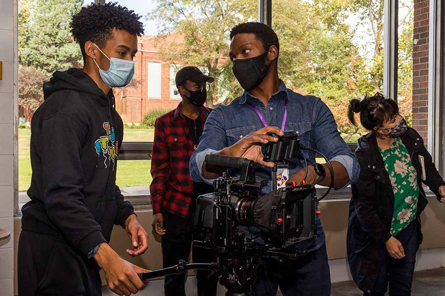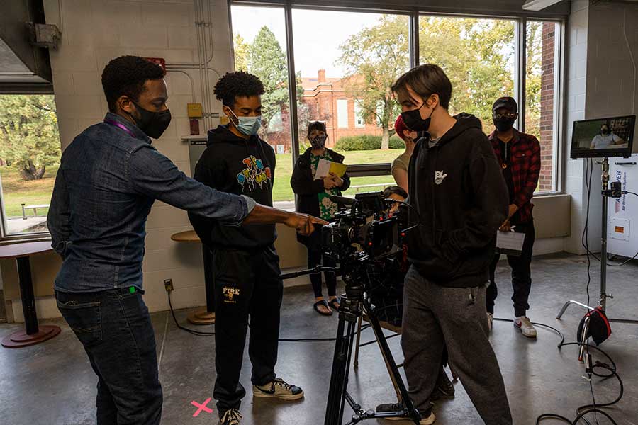 Students also worked with him to set up two shooting scenes and learn some basics about how to frame and light a subject in different locations. Everyone took on specific responsibilities as a member of the crew, such as director, camera assistant, camera operator, and gaffer. "Wow, look at that shot. You're doing a great job," Singleton told the students.