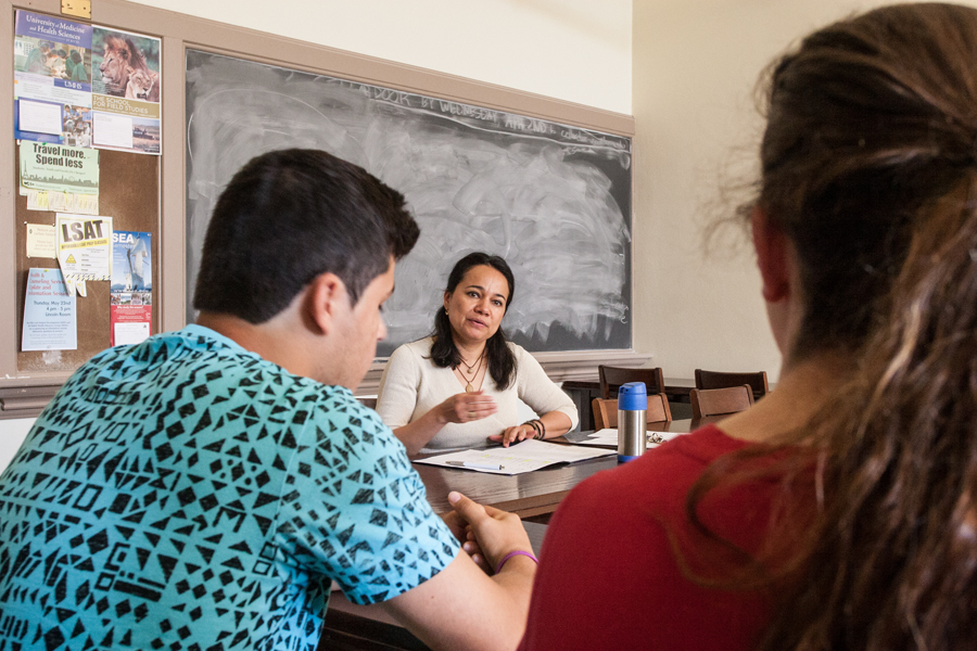 Expect to be tested. Above, Spanish faculty Claudia Fernandez explains the last oral exam of Spring Term to two students, paired at random, who will have to converse with each other in Spanish for seven minutes without the intervention of the professor.