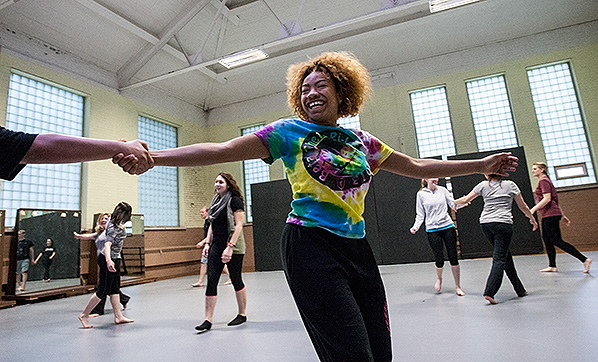 In dance class, students engaged in movement exercises, discussion, and improvisation work -- all on day one of the spring term course Dance Composition. Twenty more photos from the first day of this class are in a set at the Knox College Flickr channel.