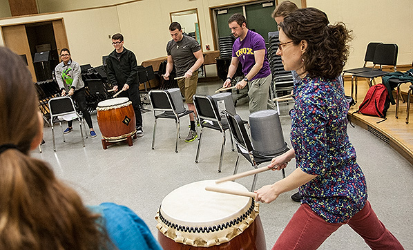 Sarah Day-O'Connell, associate professor of music, led her students in a taiko drum session in her Intro to Music course. In addition to several genuine taiko drums, the class also used five-gallon plastic buckets; an inexpensive replacement, they're often used in taiko performances. Watch the class in action on YouTube - Introduction to Music.