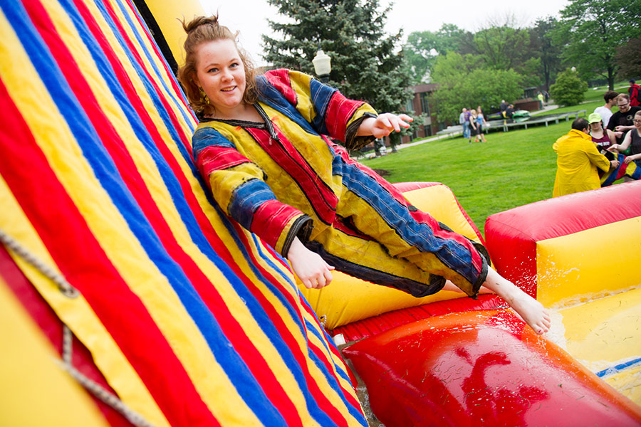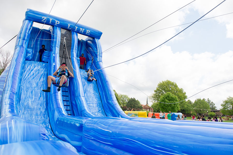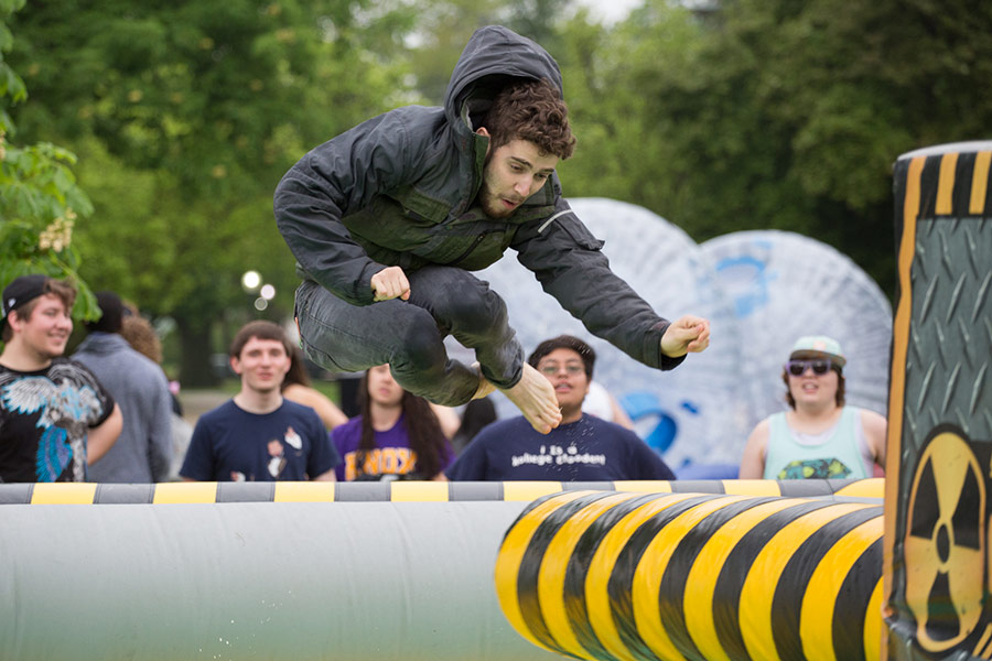 As students moved out toward the South Lawn, they encountered a velcro wall, an obstacle course, a rock wall, and a track where participants were closed into giant hamster balls before racing one another. Additional activities were rolled out throughout the day, including a tug-of-war and a faculty-student softball game with special guest star Abraham Lincoln.