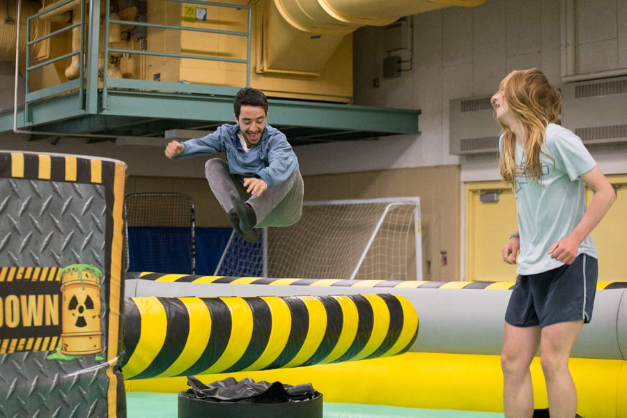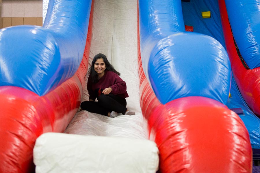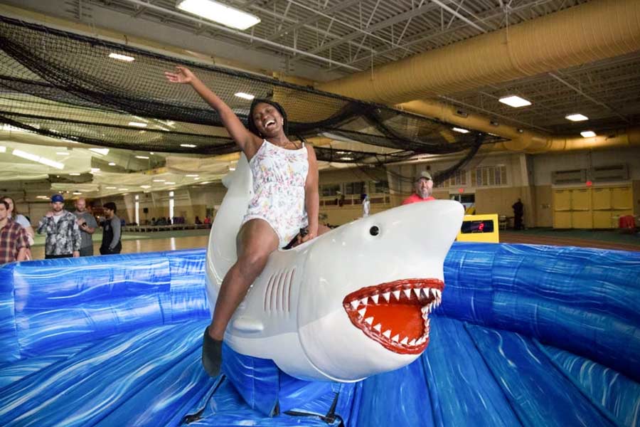 The rainy weather on April 30 meant that Flunk Day activities—such as riding down a large inflatable slide, eating churros and cotton candy, playing a real-life version of "Whack-a-Mole," and trying to hang onto a "bucking" shark—took place in the T. Fleming Fieldhouse. This year's Flunk Day theme was "Flunkin' Under the Sea."