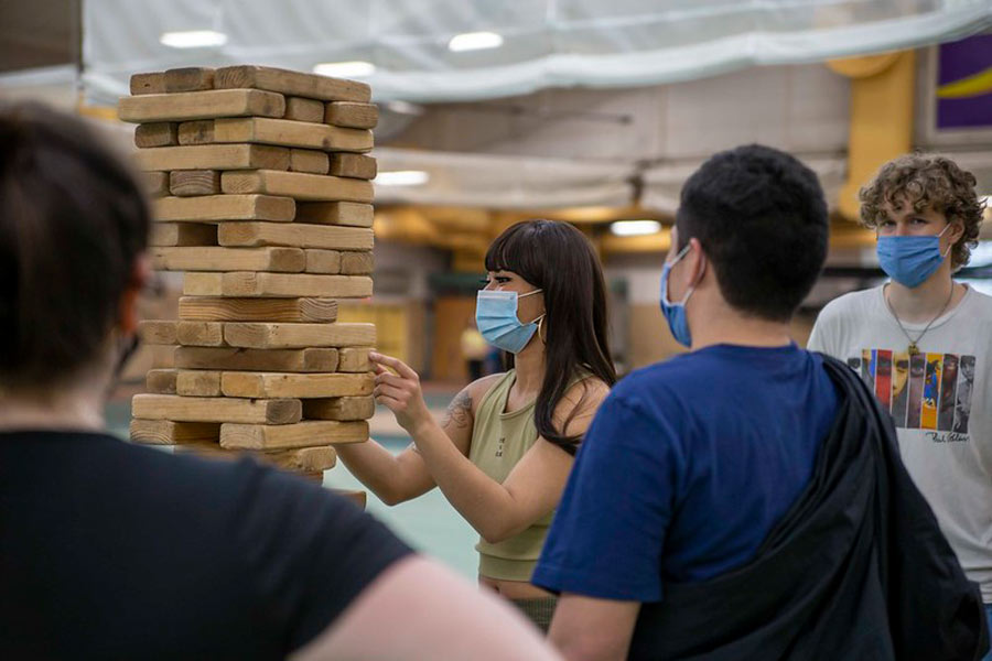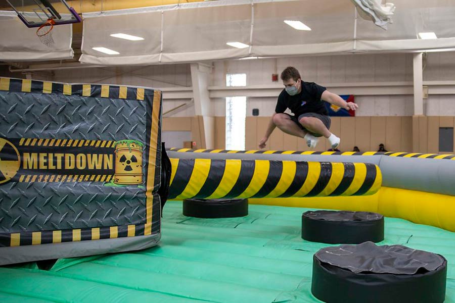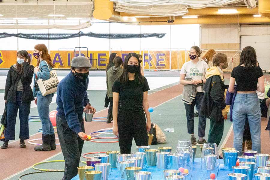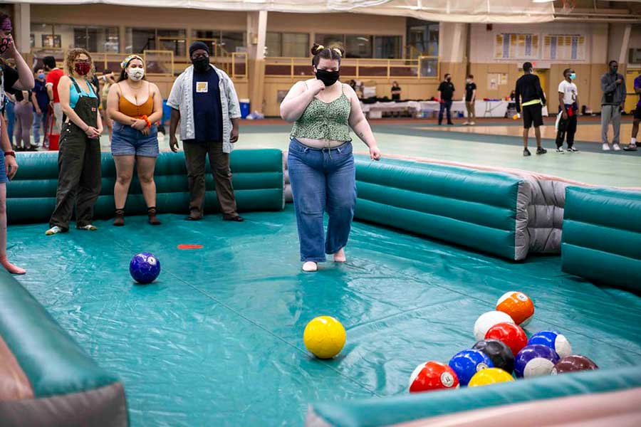 Unbeknownst to most of the Knox community, the T. Fleming Fieldhouse had been entirely transformed in the hours preceding the arrival of Flunk Day 2021, affectionately referred to as “The Comeback Flunk.” An area normally used for pickup soccer and basketball games was covered in matted spaces for bean bag toss, painting, human billiards (a mini-arena with 16 soccer balls painted with numbers and bright colors), an obstacle course, a spinning Wipe-Out style machine called “Meltdown,” and a plethora of assorted carnival games.