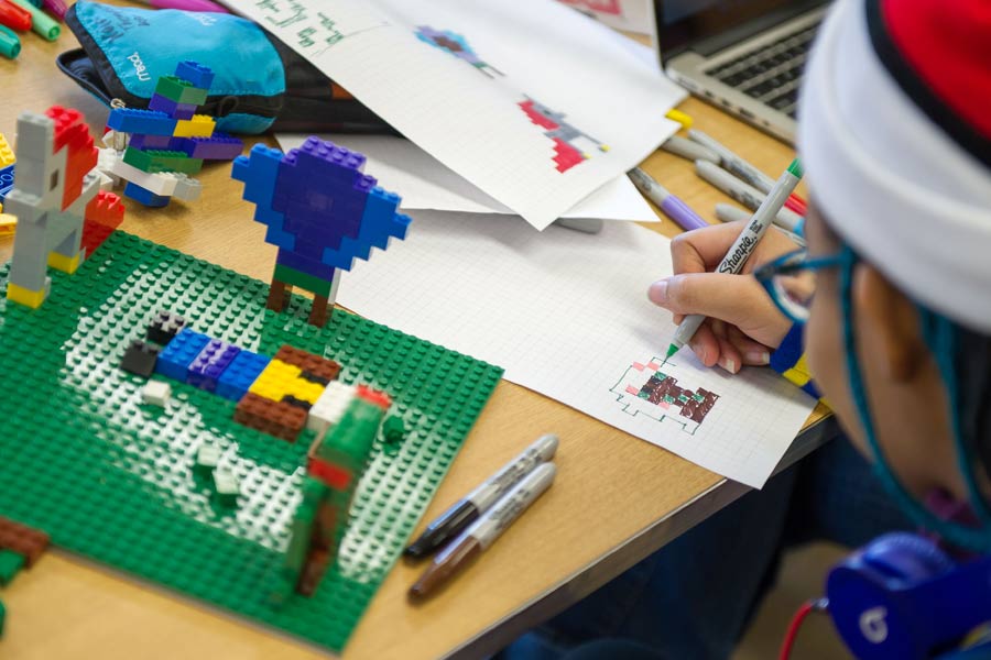 "I really like design in all of its forms, and I like watching video games, even though I don't necessarily play them all that much," said Nola Thompson ‘18, who used LEGO blocks, colored markers, and graph paper to design the game's characters. "I thought it would be fun to do something like this."