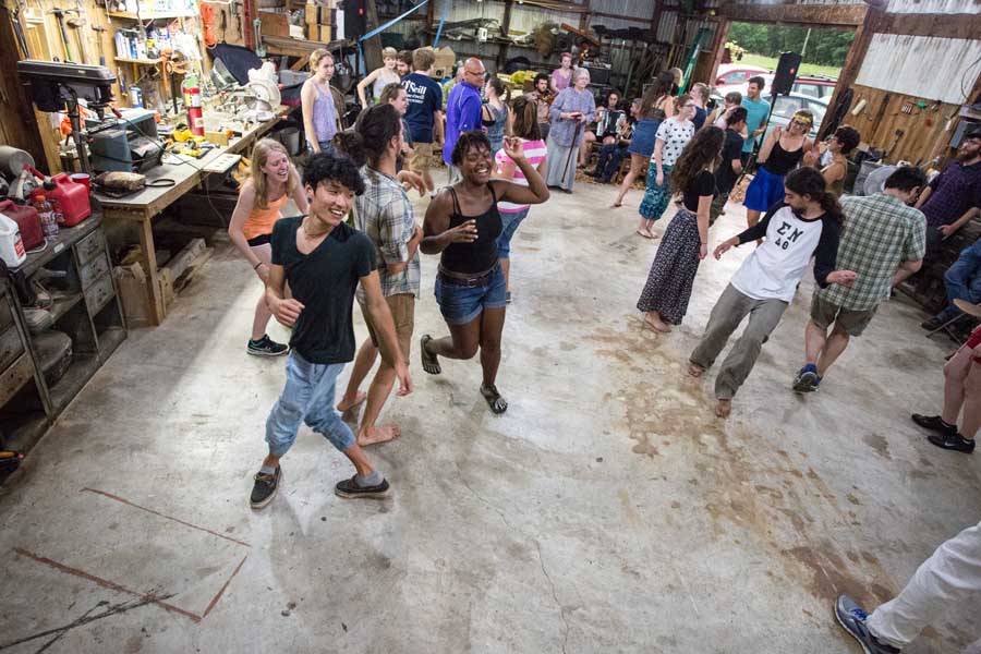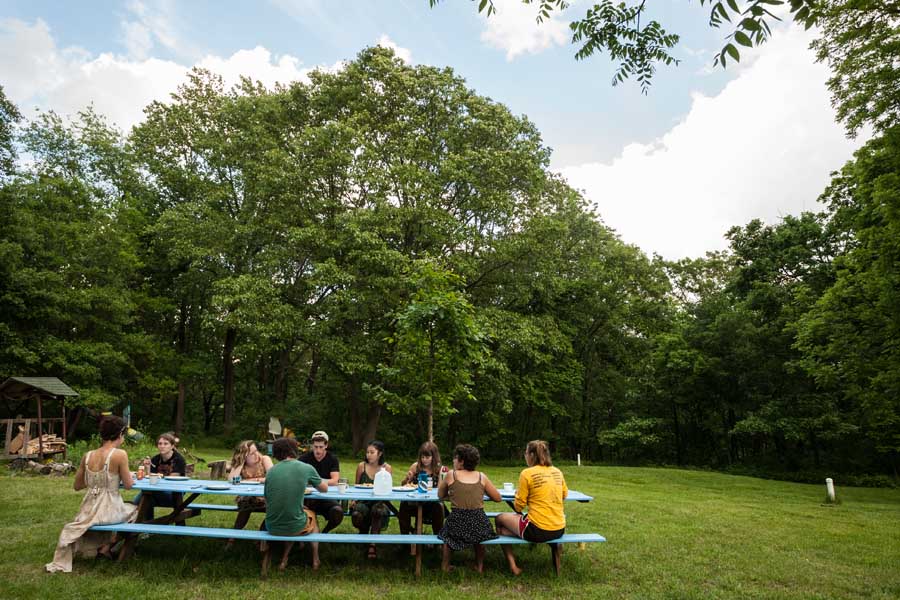 Below, a student with his creative arts project in the forest; the barn dance on the final day of Green Oaks Term; students gather for a meal outside...