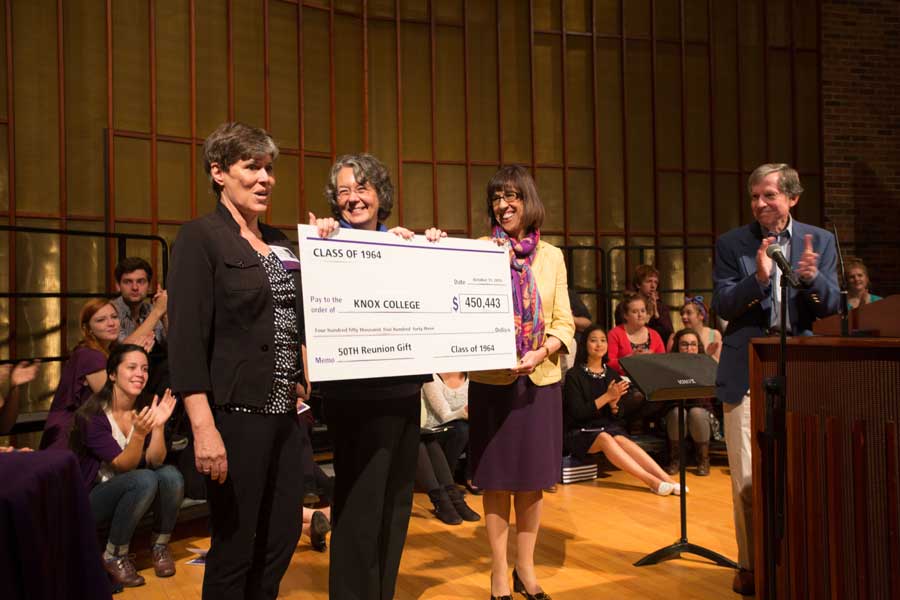 The Class of 1964, observing its 50th reunion, presented Knox College with a giant check representing the classmates' combined contribution of $450,443.