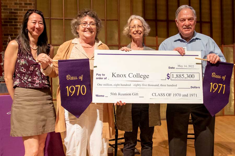 The Classes of ’70 and ’71 presented a gift of $1,885,300 to continue their legacies and impact on the College. Merry Sloan Mosbacher ’80 and Hardika Shah ’92 were presented Alumni Achievement Awards, and Shane Fogerty ’09 received the Young Alumni Achievement Award at a Friday night event that was briefly interrupted by a tornado warning. The Scroll of Honor and Knox Service Award recipients were also recognized.