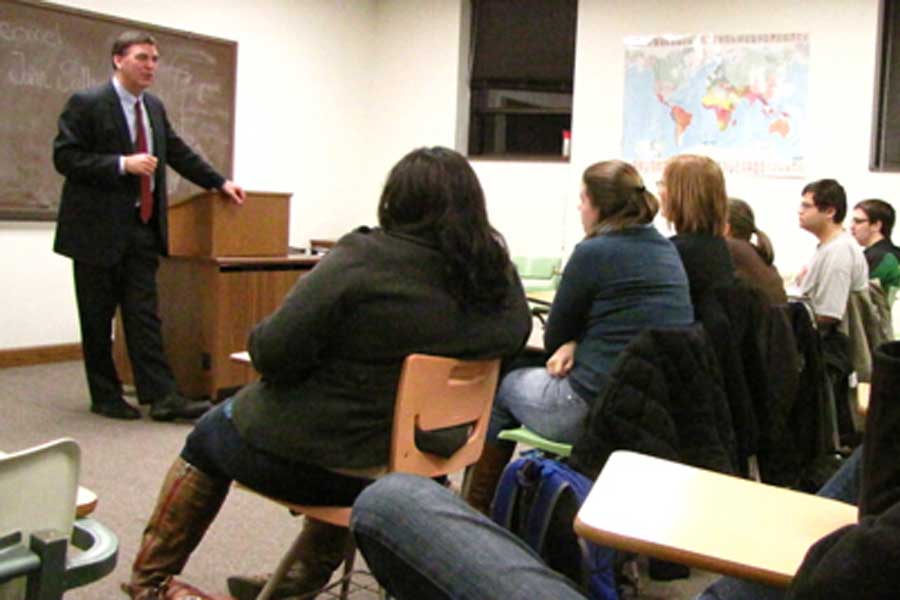 A student organization, Knox Democrats, hosted the February 20 event with Sullivan, a Democrat from Rushville. He described what it's like to campaign for office, serve in the Illinois Senate, and hold a top position as assistant Senate majority leader. He also took students' questions.