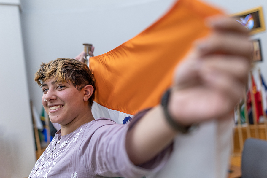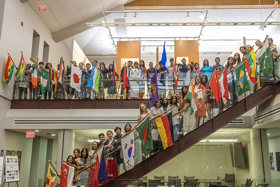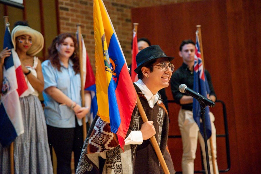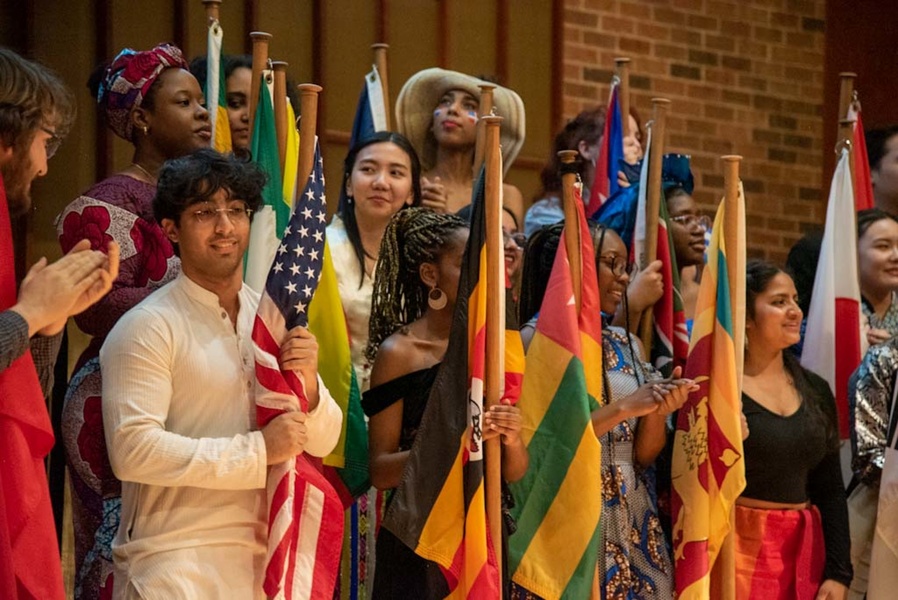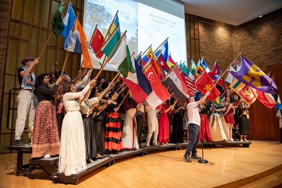 The day continued with the annual flag parade, where student representatives carried flags down the aisles of Kresge Recital Hall. Flag holders from 40 different countries all met on stage and waved their flags in unison with Director of International Student Services Alex Pia in the center with the Knox College flag.