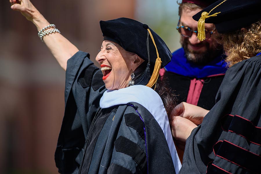 Finally, Commencement Speaker Maria Hinojosa was presented with an honorary Doctorate of Humane Letters. Founder of Futuro Media, a nonprofit newsroom based in Harlem, NYC, Hinojosa has informed the public about the changing cultural and political landscape in America and abroad as the anchor and executive producer of the Peabody Award-winning show Latino USA, co-host of Futuro Media’s award-winning political podcast In the Thick, and, most recently, her Pulitzer Prize-winning podcast Suave.